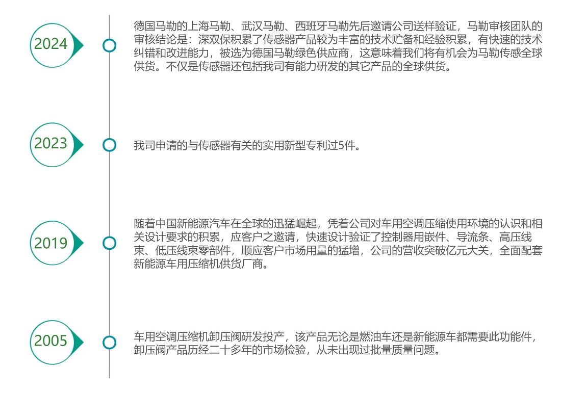 公司注册前的技术团队,1988年参与引进美国泰康技术工作,据此在我国建立了最早研发、生产车用空调压缩机热保护器的团队。深圳市深双保电器有限公司最早的核心价值产品就是车用空调压缩机热保护器。它以其强有力的技术支撑、稳定的产品质量及价格优势,填补中国无此功能件的空白,迅速占领国内外市场。多年来的研发、生产积累,该产品拥有一项发明专利和多项目实用新型专利。车用空调压缩机热保护器产品成为深双保物美价廉价的优质产品,凭借良好的市场声誉,国内外知名企业相继选定我司作为合作伙伴。